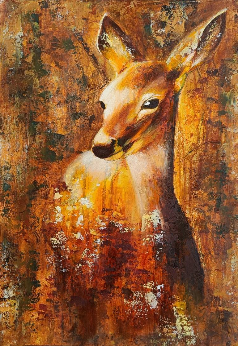 "Tranquil Elegance: The Gentle Deer" Find Solace in the Gentle Heart of the Wilderness. The painting is a mesmerizing masterpiece of abstract realism, capturing the serene essence of a deer. Created with a delicate blend of mixed media supplies on paper, the predominant colors of soothing yellow an...