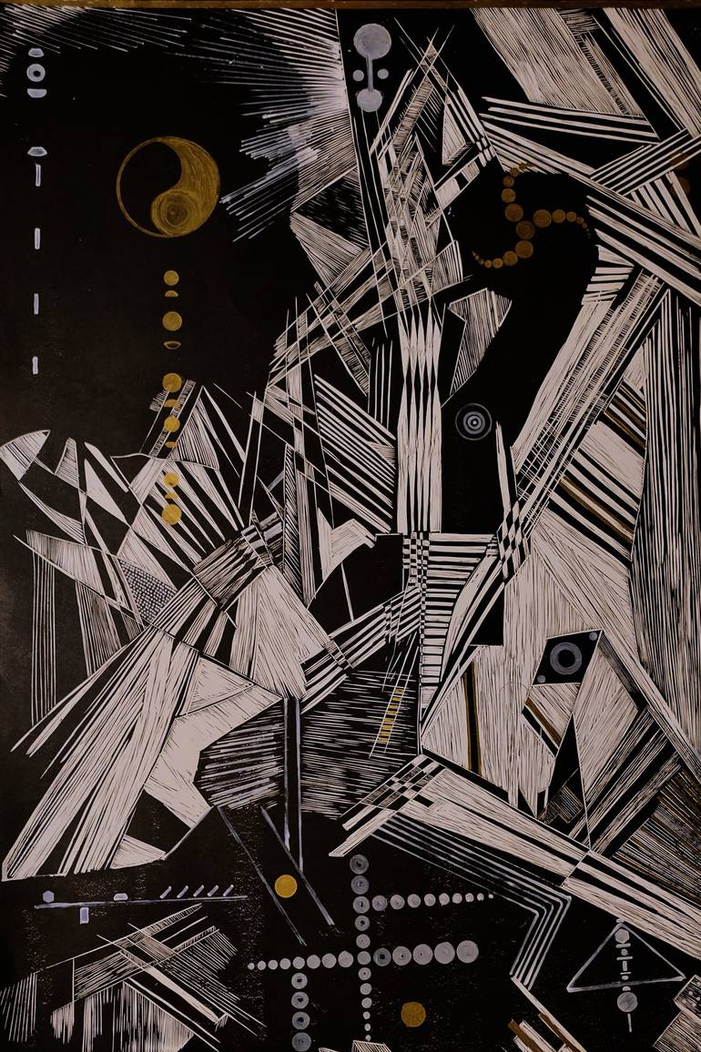 A geometric composition in which UFO pictograms are hidden. The basis of this painting was a linocut, a graphic I created a few years ago, and since the topic of UFOs often appears in my life and interests, I decided to immortalize it in the form of signs that are shown to us in fields or meadows by...