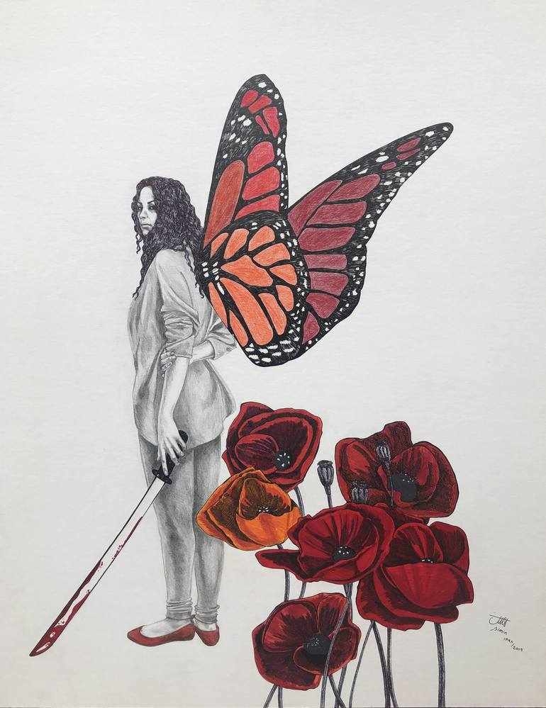 This is an artwork from the series entitled: Seppuko Seppuko is a Japanese tradition when the warier is defeated. In this series I am focused on the daily resistance of women for their rights in the Middle Eastern and Iranian society. The butterfly wings and the flowers are the beauty of the life ...