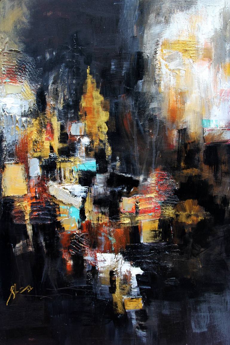 This is a metal abstract cityscape made on wood with acrylics. This will be neatly bubble wrapped and has hooks at the back ready to hang.