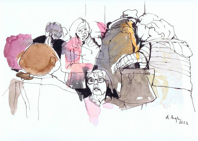 Visitors at the opening of an exhibition, captured using very quick brushstrokes on a watercolour background. This mixed media drawing comes in an off-white mount.