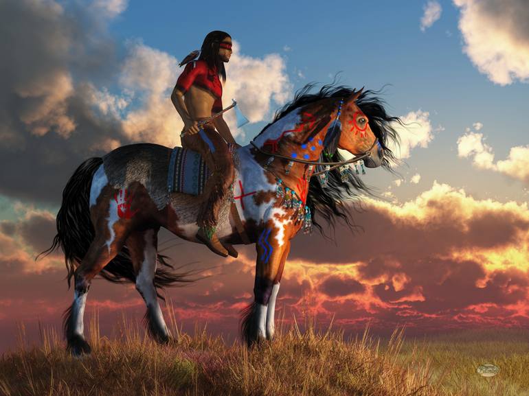 On endless grassy plains, an American Indian warrior sits on the back of his trusted war horse and watches as the sun sets in a sky filled with puffy clouds. The Native American man carries a tomahawk and wears red and black war paint. The mustang has a dun and white pinto coat and like the brave ...