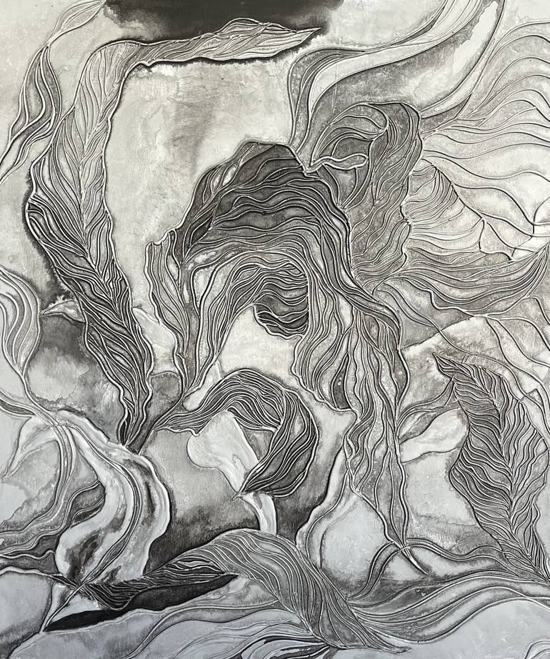 This monochrome artwork weaves together intricate, flowing lines that evoke the delicate forms of leaves and organic patterns. The composition dances between abstraction and nature, where textured grooves create a sense of depth and movement. The subtle interplay of light and shadow accentuates the ...