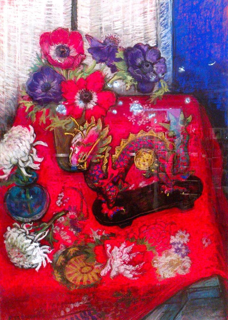 My partner had gone to China on a business trip and bought me back the Chinese Dragon. This inspired my art work. I so liked the image and colours that it featured in my still life with the Chinese silk Kimono. I love these oriental shapes and colours especially the mandarin reds. I have painted a s...