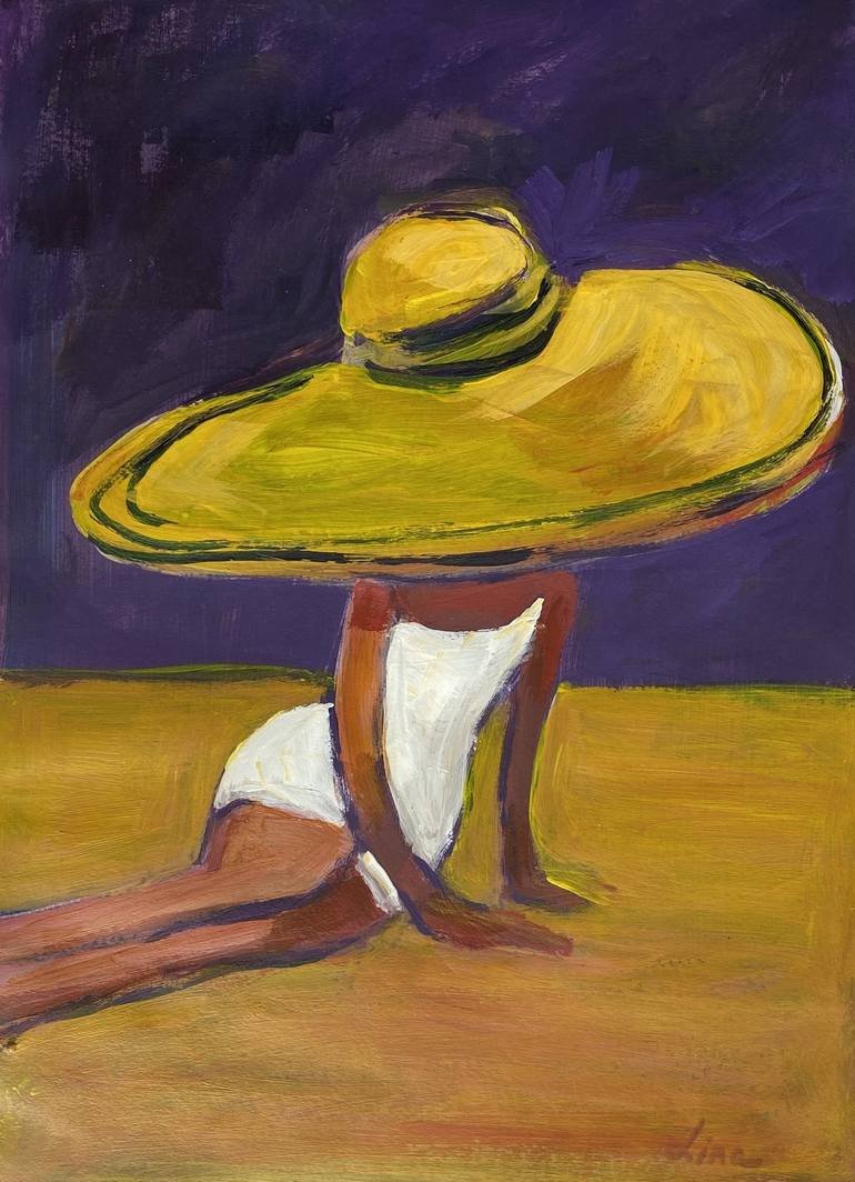 Yellow Hat is an original painting in tempera and acrylic paint on watercolor paper. I painted this nostalgic scene of a woman gracefully sitting on a beach, hidden under a large yellow hat in a very reduced illustrative manner to create a feeling and style of the South of France in the mid twentie...
