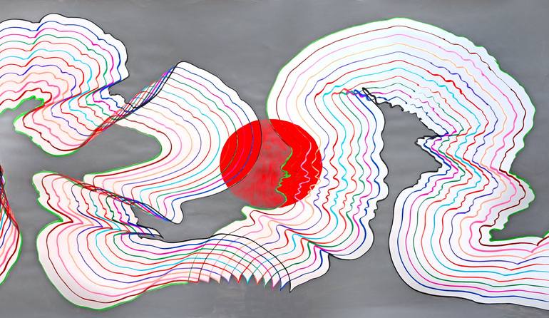 This artwork presents a dynamic interplay of undulating lines and vibrant colors against a subdued gray background, creating a striking visual contrast. Central to the composition is a bold red circle, providing a focal point that captures attention and evokes a sense of movement, reminiscent of a r...
