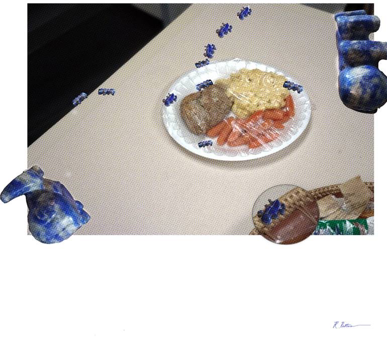 This is a photo of the "free lunch" they gave us on the night shift. I added the bugs which are hand sculpted and polished by me out of lapis lazuli.
