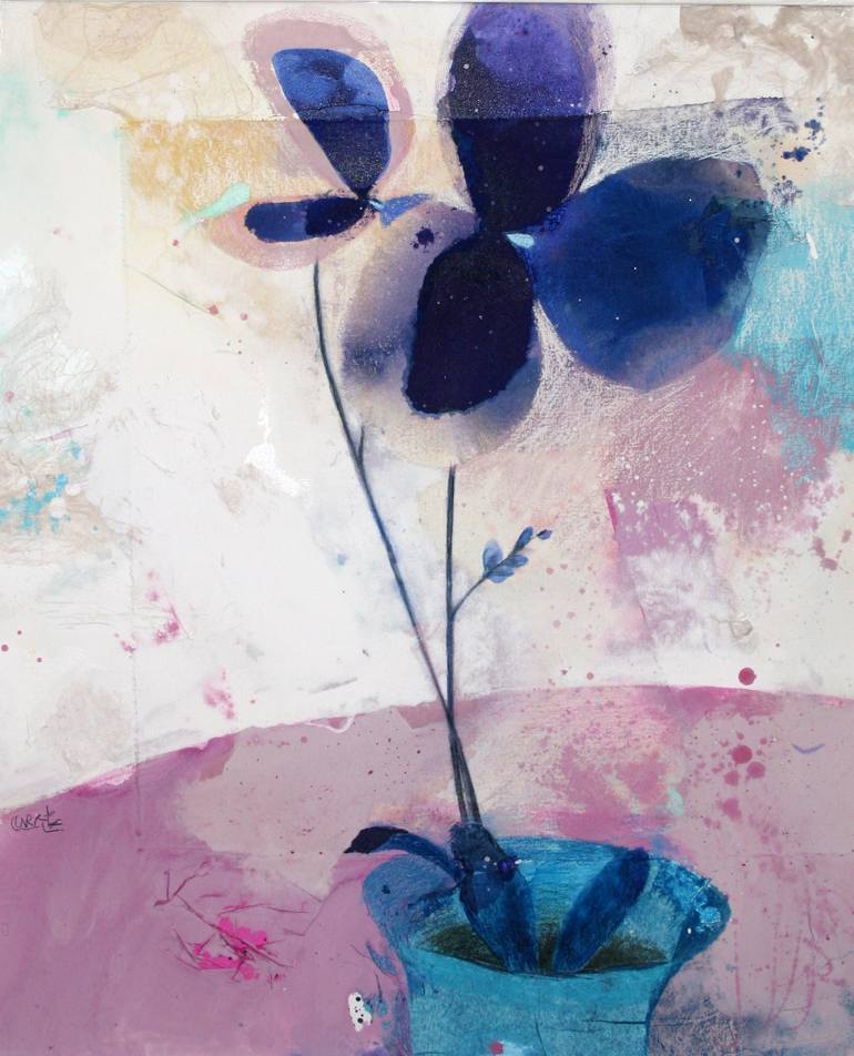 This picture was painted from silence, without expectations, freely allowing what comes at every moment. The blue flower becames orchid ... painted above paper and cloth collage, with acrilic , pastel, colour pencils ... mixing materials end techniques....