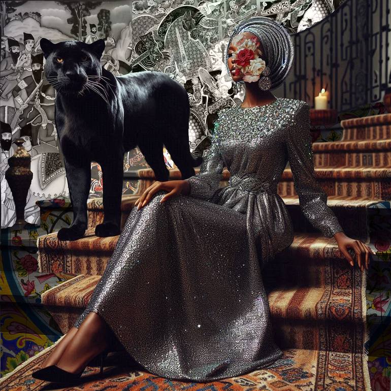 This image is an artistic fusion of luxury fashion, symbols of power, and Persian cultural elements. Image Details: • The nigerian woman: She wears a long, shimmering silver gown with intricate textures, exuding a sense of opulence and strength. • The Mask: Her face is covered with a combinatio...