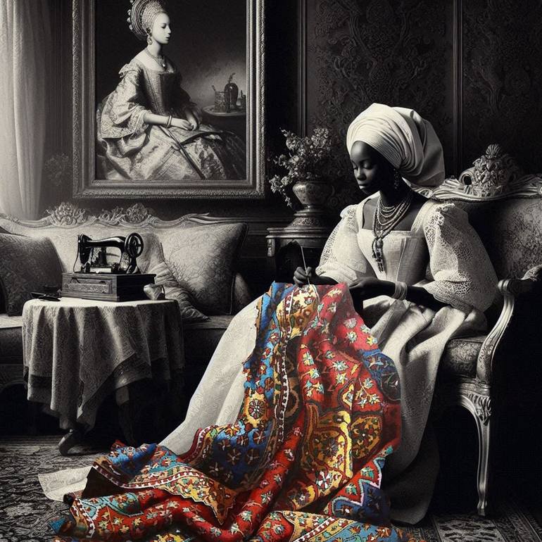 The strength of ancient women was not just in their hands, but in their wisdom, resilience, and the legacies they wove into history.” This image is a digital artwork that shows a combination of classic realism and modern contrast. The overall space of the image is designed in monochrome (black and...