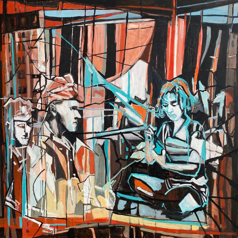 The present original artwork, painted with high quality oil paints on canvas and stretched on the wooden frame, which in the case of sale would have to be removed in order to send the artwork rolled up in the tube (this is necessary because of exporting problems of wood), on the one hand it is a tri...