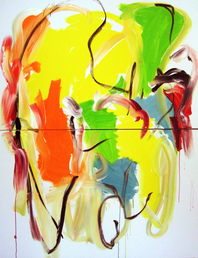 It seems as if memories resonate in these abstract, expressionist painting; as if we would recognize landscapes, flowers , people who dance through lively streets , silent sunlit places , swirling micro-particles escaping rigid patterns. The main issue these paintings have in common is a strong sense of movement . Power and energy seems to float through these images. They convey feelings of liveliness even in those paintings that prefer a more calm and quiet atmosphere. Layer upon layer is placed on the canvas to slowly release an impression that can be described as the painterly equivalent of a "frozen moment in time". The liquid paint almost reminds us on blurred motion stills in photography and is set against the contrast of clear colourfields. Each new layer reveals new perspectives, to be partly covered and allow further points of view.. During this process each image develops its own concept.