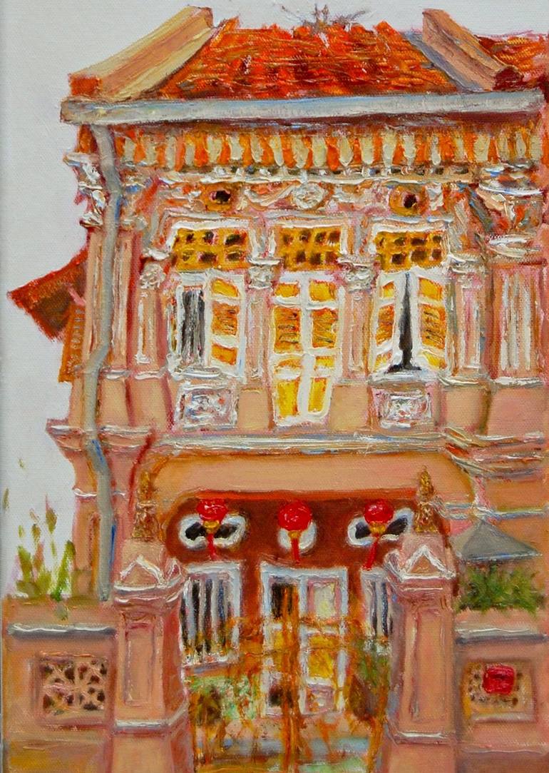 Add a touch of vibrant color and traditional Peranakan charm to your home with this exquisite amber shophouse oil painting, part of a series of 8 artworks featuring a famous row of colorful traditional Chinese shophouses in Singapore. Each shophouse has its own unique character and personality, whic...