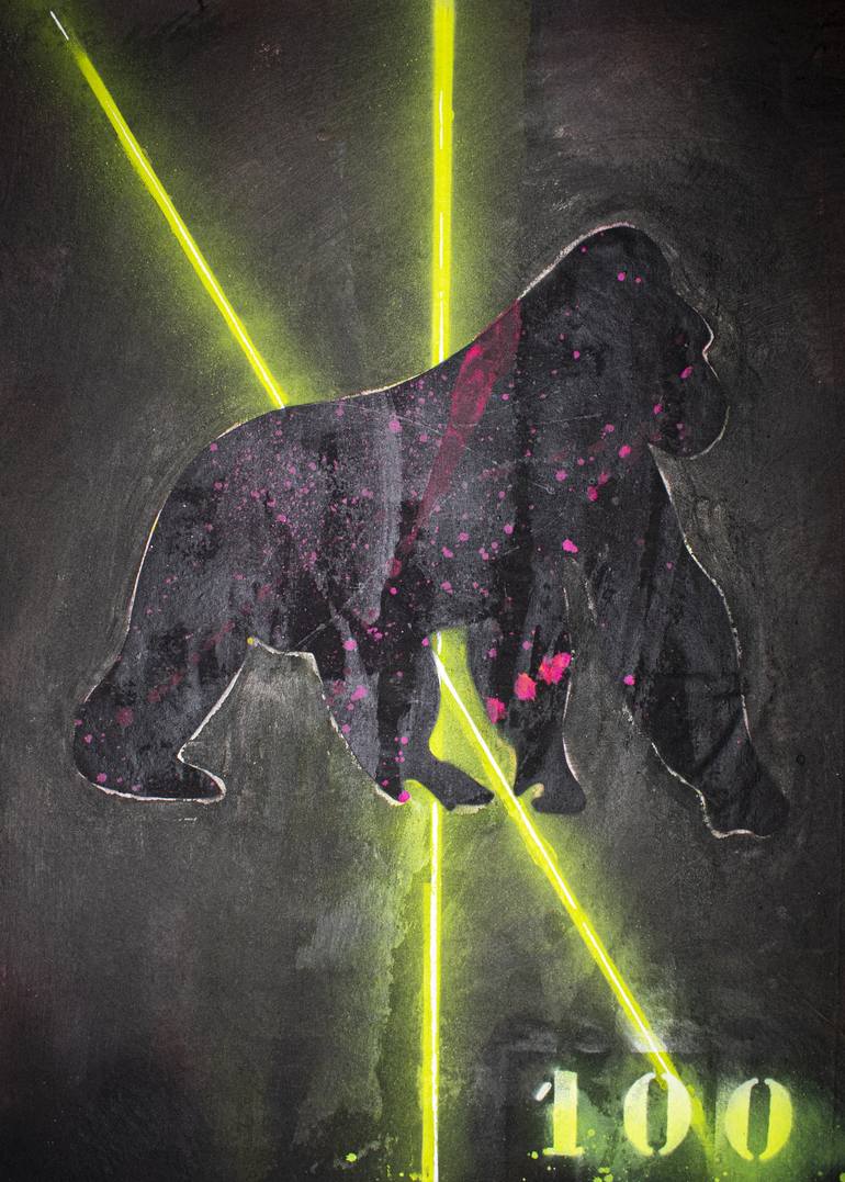 This iconic image is full of meaning, using one of the simplest forms of sacred geometry, this two lines are the beginning of all life forms representated with neon rays with the body of a primate, our origins All the works are sent with the loose fabric without frame and in tube for a greater care...