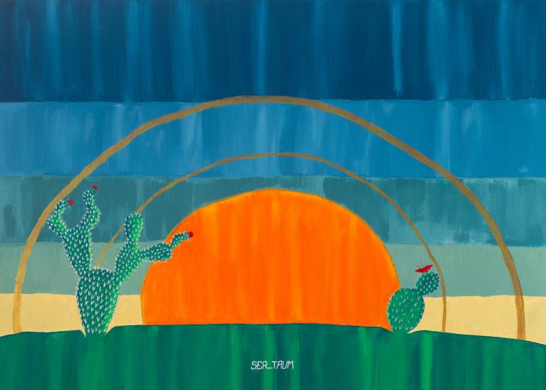 18h is the time when the sun sets on the horizon, tinting the sky with yellow, blue and greenish tones. In this work in the foreground are two species of cacti, two prickly pear framing the west. This work symbolizes the home window through which we look at the horizon after a day's work.