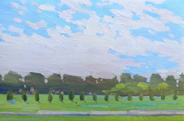 Painting by Kuchura Miroslava bye at the Saatchi. This painting takes us to the vast landscapes of the Bakota valley in Ukraine, where the wind seems to bring the scene to life. Light brushstrokes and dynamic lines convey the movement of air sweeping across the green fields and mountains on the hor...