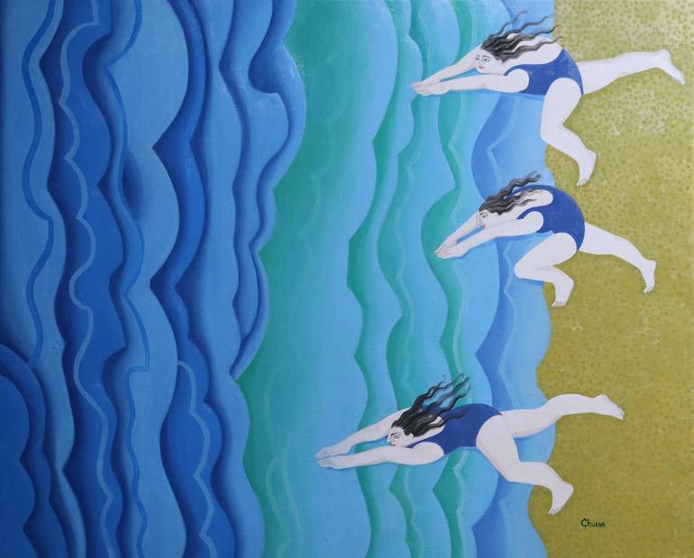 2025-05-14 Sonya Chueva Summer sea, three divers. Painting, Oil on Canvas. Ready to hang. 2025