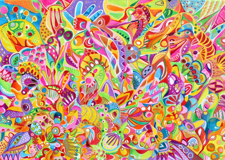 This is an abstract colorful painting. It reacts to a neon light. I love to paint colorful doodles. his painting took me four days to complete. I have used acrylic, gouache, watercolor, markers, and spray to paint it. This artwork is extremely colorful and positive. I have added it to my redbubble ...