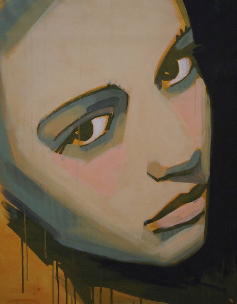 girl's face painted over yellow background w blue undertones