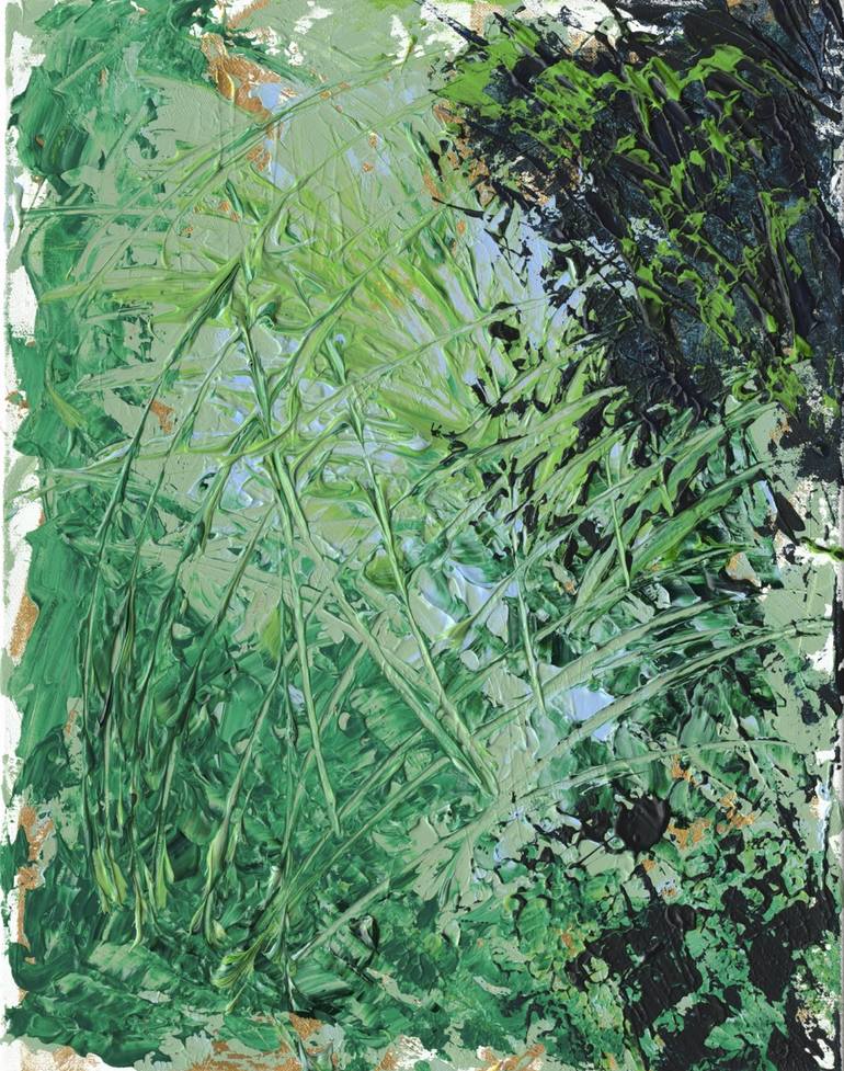 This is part 2 of the 3-Farben-Series (3 Colors, Green, Red and Blue). It is one of my lighter paintings, capturing the spirit of spring, of growth and of hope. It has a lot of structure and gives you at lot to look at.