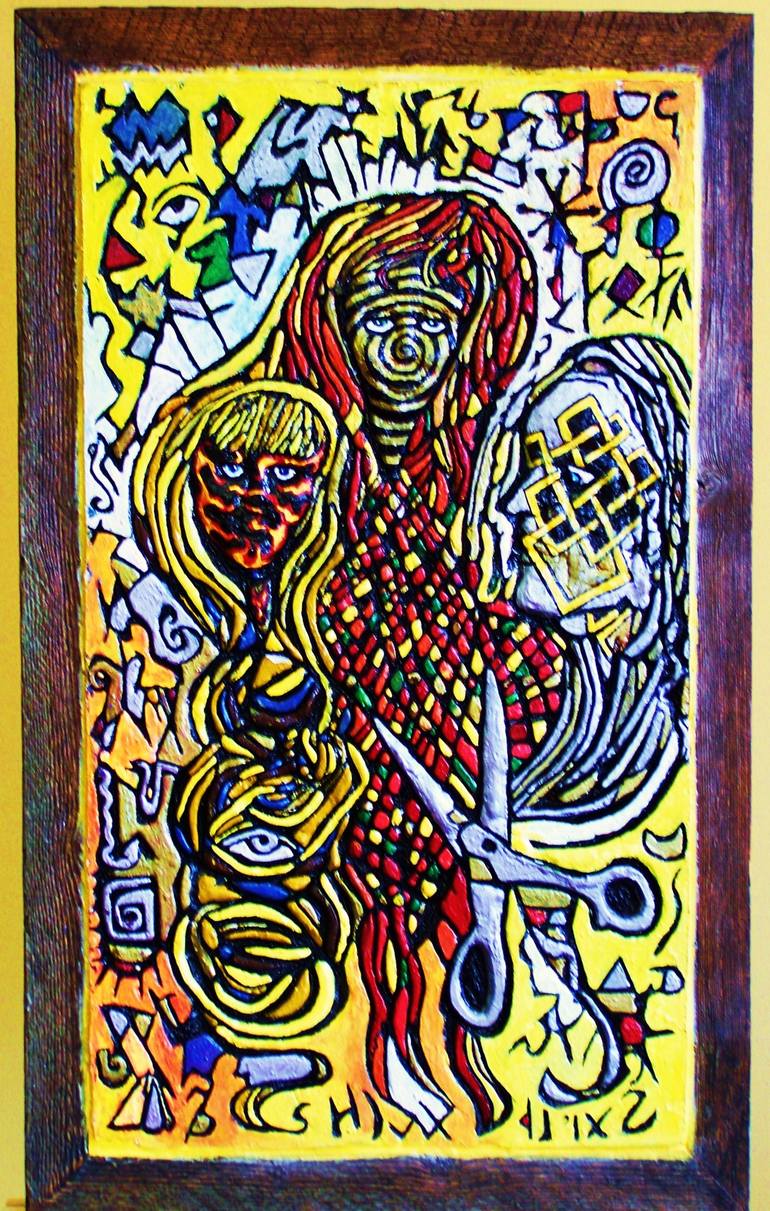 "3 Fates in Endonesia" was inspired by the multi-cultural myth of the three females, one for each stage of life. I was also listening to a lot of Dr. Dre at the time. I chose to create this piece on carved plaster because it's a fun, flexible medium. Also, I refuse to submit to the tyranny of can...