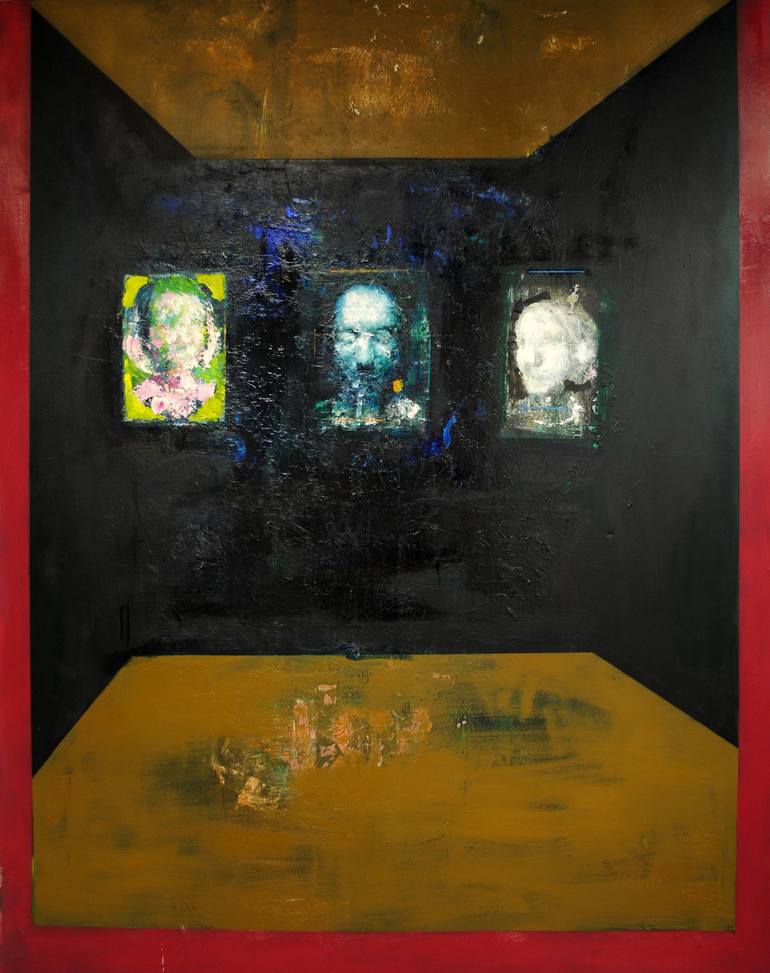 Paintings within a painting. 3 different portraits suspended within an abstract space.