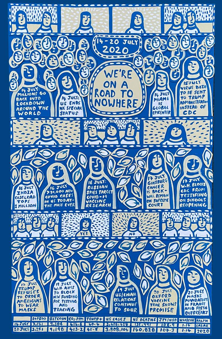 Ralph Lazar chronicles his own life and the world around him. He contemporaneously documents current affairs by creating art in real-time as the news unfolds, and combines this with a stream-of-consciousness self-expression inspired by people, words, music and travel. His work has been showcased at Art Miami (Context), The LA Art Show, Art Palm Springs and Art Market San Francisco amongst others. In January and February 2020, his artwork appeared on 1,700 digital screens across New York City. Recurring themes through his work are current affairs, race relations, Civil Rights, US Presidential history, the US Supreme Court and the US Constitution.