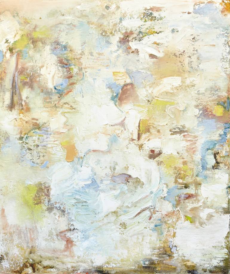 Painting stems from looking at the fog roll in above Florence. Has soft, more muted colors with bits of brighter tones. Lots of texture and movement. Has a meditative quality. Tranquil painting.