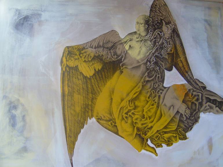 Angel on abstract setting. Figurative work on color play. Reference to classic art.