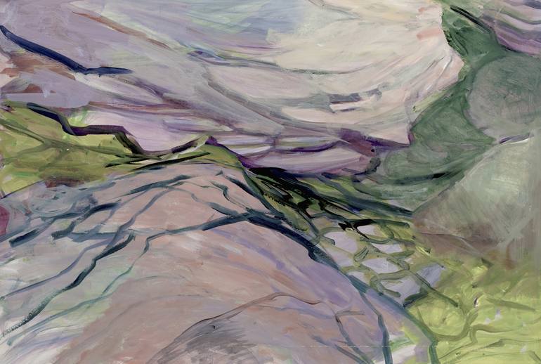 A loose representation of a small section of the Mink Hollow Stream, intensifying the more subtle colors found there to suggest the lively interaction of the water as it moves around and under the rocks.and vegetation.