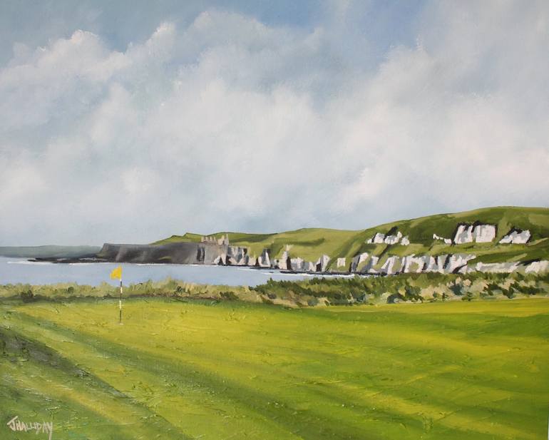 The iconic 5th green at Royal Portrush Golf Course home of the 2025 British Open. The competition was previously played there in 1951 and again in 2019 and returns next year. The 5th green has views over the White Rocks Beach and Dunluce Castle. The painting is an oil painting on canvas board and m...