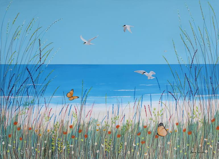 A Bright Bright Sunshiny Day is a large modern landscape painting of a beach scene with butterflies, seabirds (Terns) and wildflowers in vibrant colors of blue, green and orange. In this series of idyllic nature paintings I am trying to create a peaceful calm setting while at the same time producing...