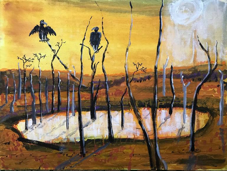 A walk on the C&O towpath on a bright day with imagination. A progression of a few layers, wiping, washing. A feeling of being watched, noticed by those who wait for those that die. Acrylic. Wash