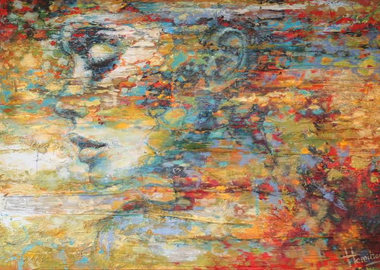 The title speaks for itself. Different shades of gold have been richly used in this painting They light up beautifully when the light falls on them. The contrast of the rugged background made of thick gesso and dried bananaleaves and the beautiful painted portrait makes this artwork very special. ...