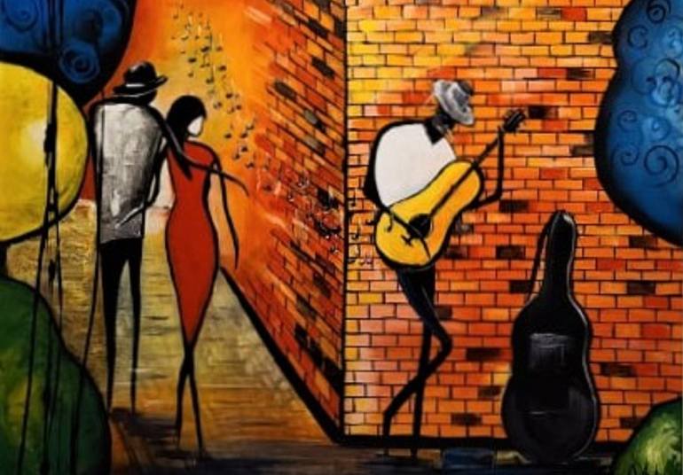 A Guitar Player. This is a bright abstract painting with a city downtown. There a guitar player who lined to the wall and enjoying music he plays, and there a couple who went through and a girl turned her head toward a guitar player. Is she fell in love from the first glance? Maybe she knows him? or...