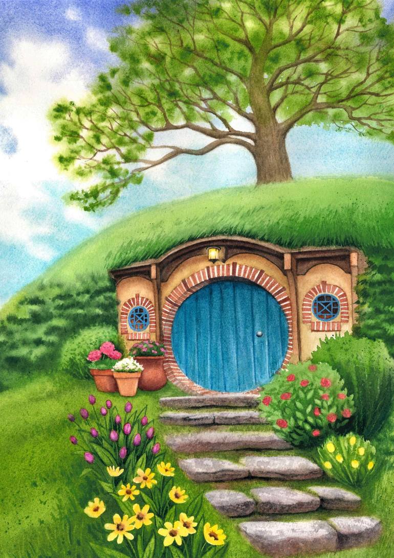 Bright, beautiful, and vibrant colors were chosen as much as possible to depict an iconic representation of a typical Hobbit home. I wanted this painting to instill a sense of peace and tranquility upon the viewer, gently inviting them in through a beautiful door to experience the idyllic lifestyle...