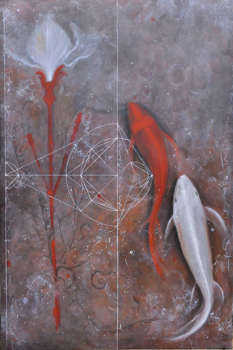 Narrating a journey for two in translucent waters the artist has captured an amicable journey of two carps. Their streamline swim is unhindered, and the silky sway of their delicate tails only exemplifies the ease of their seamless journey. The lone water lotus reflects the pigments of the red and s...