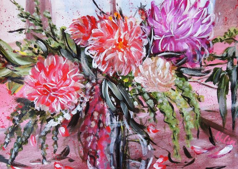 A LIFE TIME BANQUET -Dahlias- 24/3/2018 . H,Lin 29.5*42*0.1 cm Acrylic on Paper , Framed size 62 x 45 X 3.5 cm Framed, ready to hang Here it is a life time banquet on the table . Somebody left ,Somebody stay. If I am lucky enough to sit by your side , allow me to give you a heartfelt smile ...