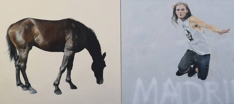 I have recently made a series of small paintings which are diptychs. They vary from being a definable situation with figures against a wall or in some cases, like this painting two canvases creating a narrative by bring together disparate images. The horse in the painting is the same image used in o...