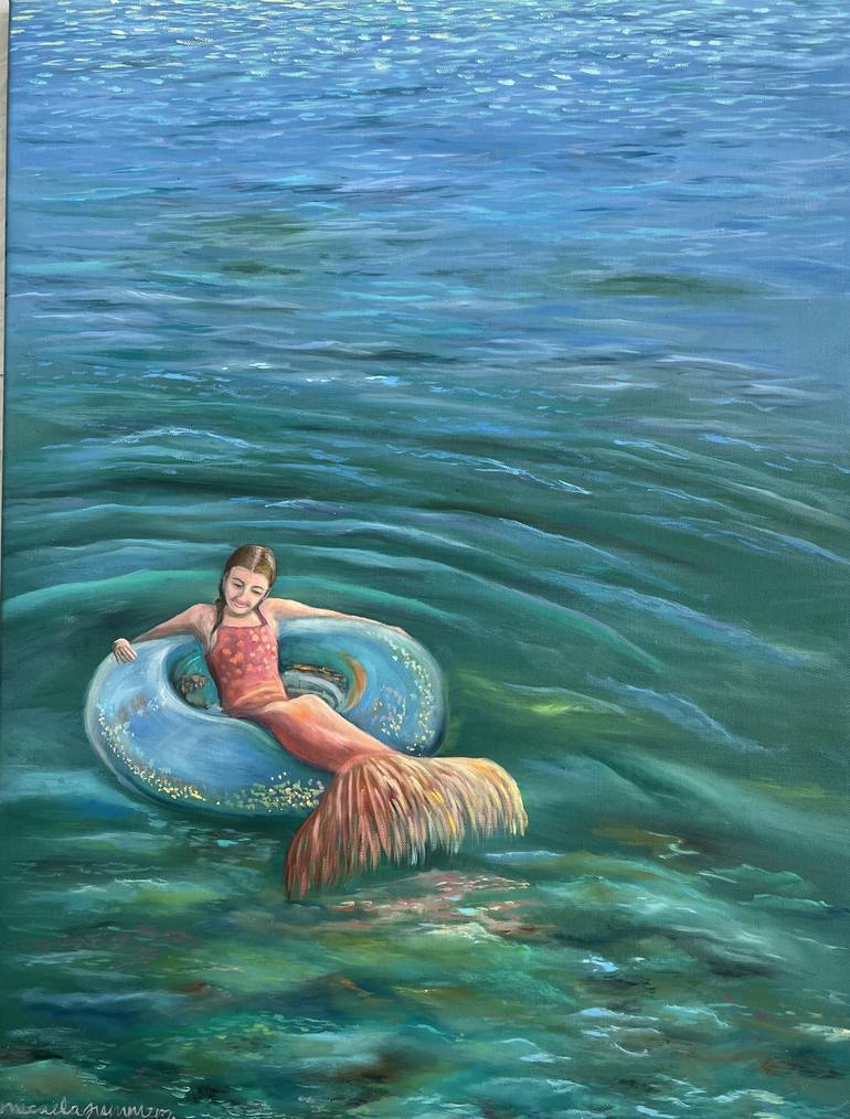 In this art piece, I've captured a serene moment where the realms of fantasy and reality blend subtly. Using oil on canvas, this portrayal of the mermaid enveloped in the cool embrace of lake waters, seated tranquil in an inflatable ring, invites the viewer into a realm of serene surrealism. The vib...