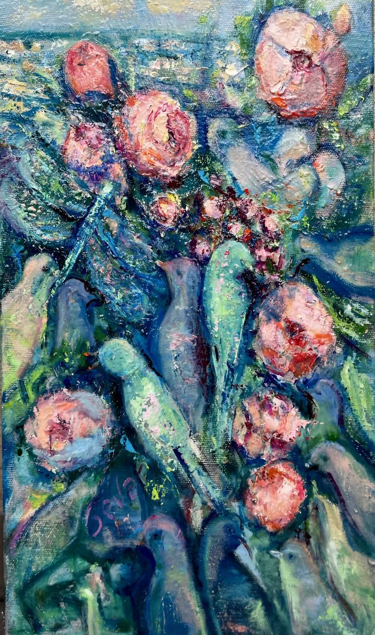 I really like to paint flowers, birds, nature in oil. I like to make strokes, mix colors, and then look at what happened and enhance it. In this work, I suddenly saw a sleeping girl with a baby in her arms. And this gave a special meaning and symbolism to the whole picture. I really love this pictur...