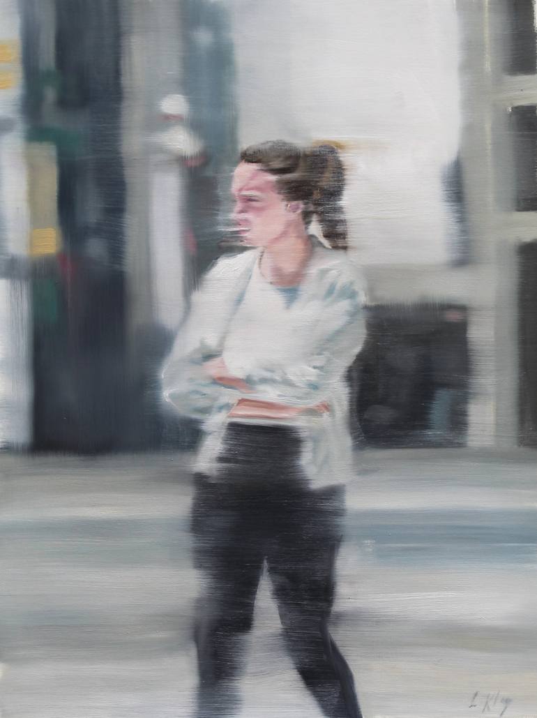 Walking in the city, she takes a moment. It was her moment to clear her head or make clear her direction. Although it was hers, the viewer can get a glance into this moment. The painting is on heavy, primed paper, painted with oils and blurred with the brush and paint to emphasize our inability to c...