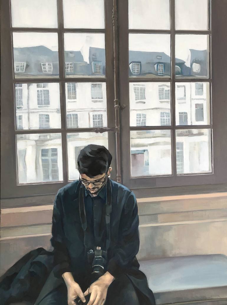 This painting is from a observational sketch and photo I took while visiting a Paris museum. A photographer who was taking a break during his museum visit. This serene image against the city background gives me a pleasant inspiration.