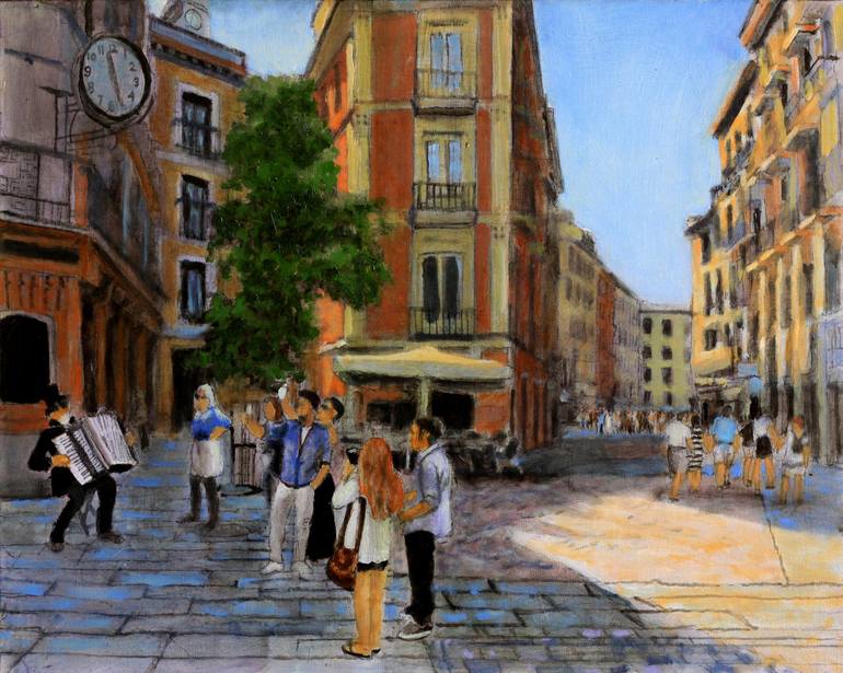 A group of tourists is captivated by a local musician, just one of the attractions of a walking tour I love the work of Maxfield Parrish and Claude Monet and use their working methods as a departure point for my work. I always try to paint on fine weave linen using glazes for depth and richness, an...