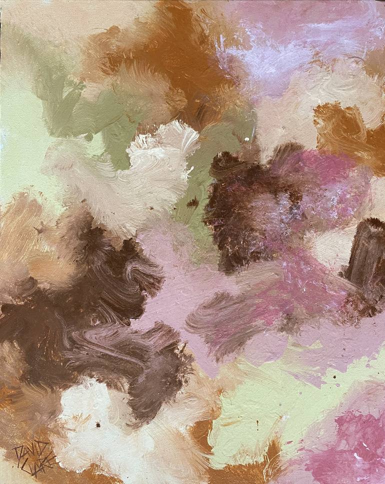 An abstract painting in pinks and creams created by playing with paint, colour and texture.