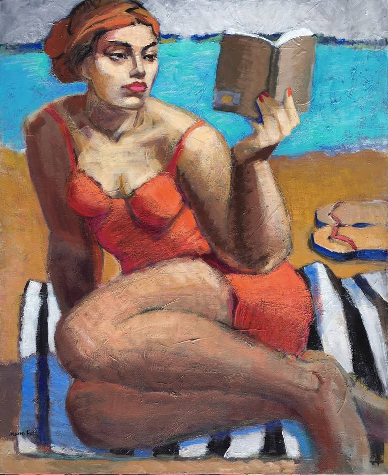 I love creating abstract figurative paintings of women engrossed in their own world whatever that may be. This woman loves reading her book in summer at the beach by the ocean. I wanted the colors strong to suggest the light and her focus on the book. The texture of paint and drawing with crayons is...