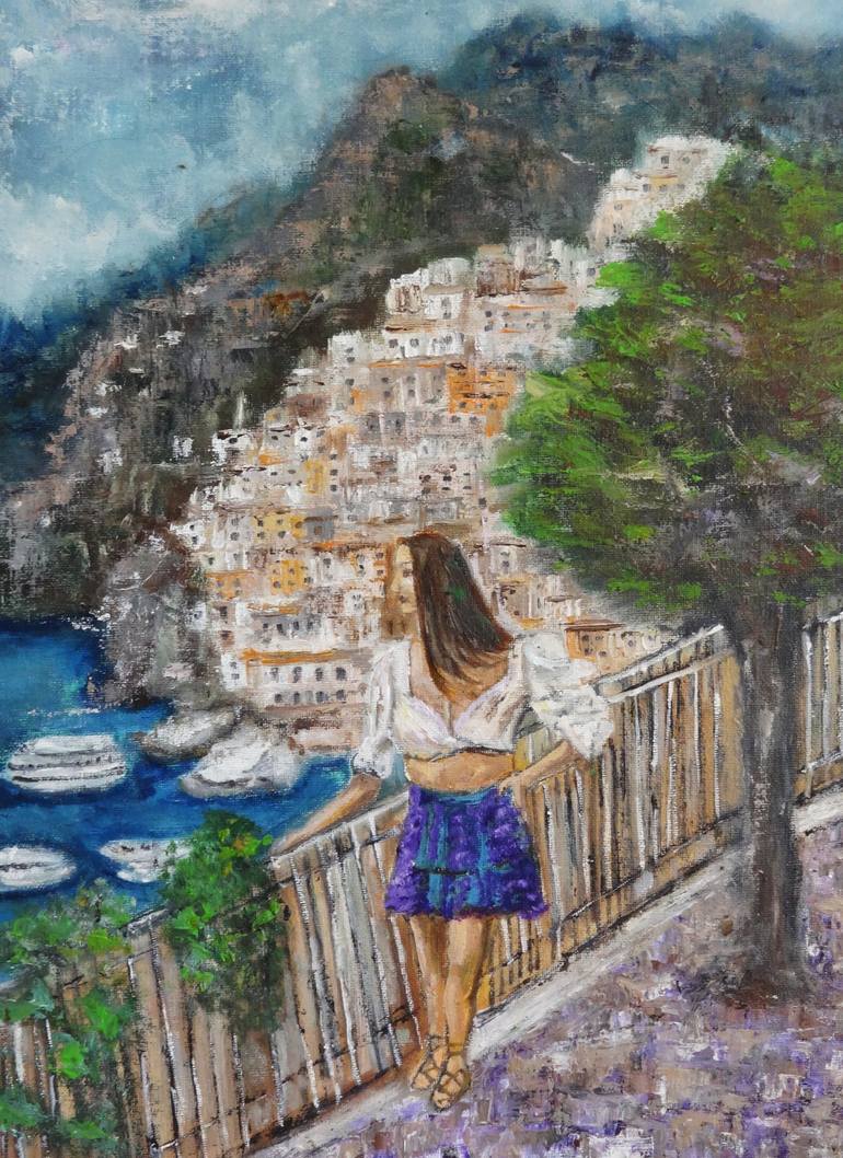 This captivating oil painting portrays a young woman standing along a scenic viewpoint overlooking the breathtaking Amalfi Coast. Dressed in a flowing white blouse with puffed sleeves and a stylish blue skirt, she leans gracefully against a rustic railing, gazing at the picturesque hillside town cas...