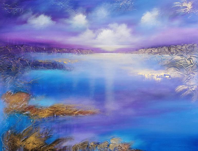 A large semi-abstract beautiful structured mixed media painting of a seascape with the sunrise with deep (4cm) painted edges, so it can be hung immediately without framing. Nature is my greatest source of inspiration. I am trying to convey the deeply spiritual atmosphere of the present moment. Thi...
