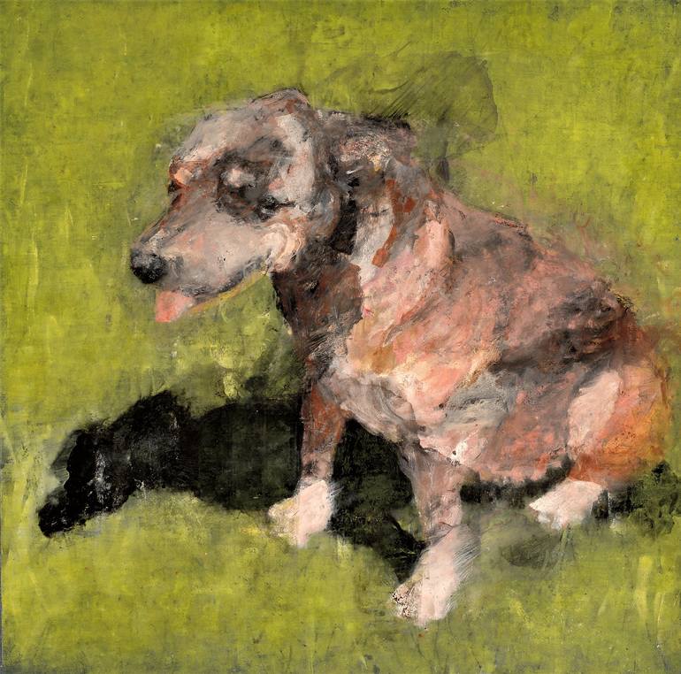 An exhausted dog who seemes to crumble under the effect of paint. It is a question here of figuring the movementby using an immobile subject, to create a paradox. Several times are superimposed, the time of the image and that of painting. Stetching, dilution, the feeling of something escaping. Oil ...