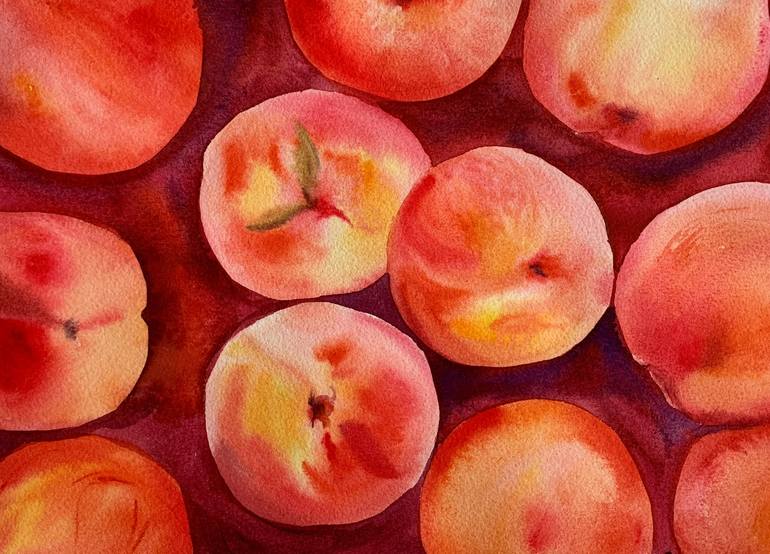 This artwork, titled "A Box of Peaches," is a stunning watercolor painting on 100% cotton paper. It beautifully captures the essence of ripe and juicy peaches. The vibrant colors and meticulous detailing bring these fruits to life, making them almost appear good enough to pluck from the canvas. This...